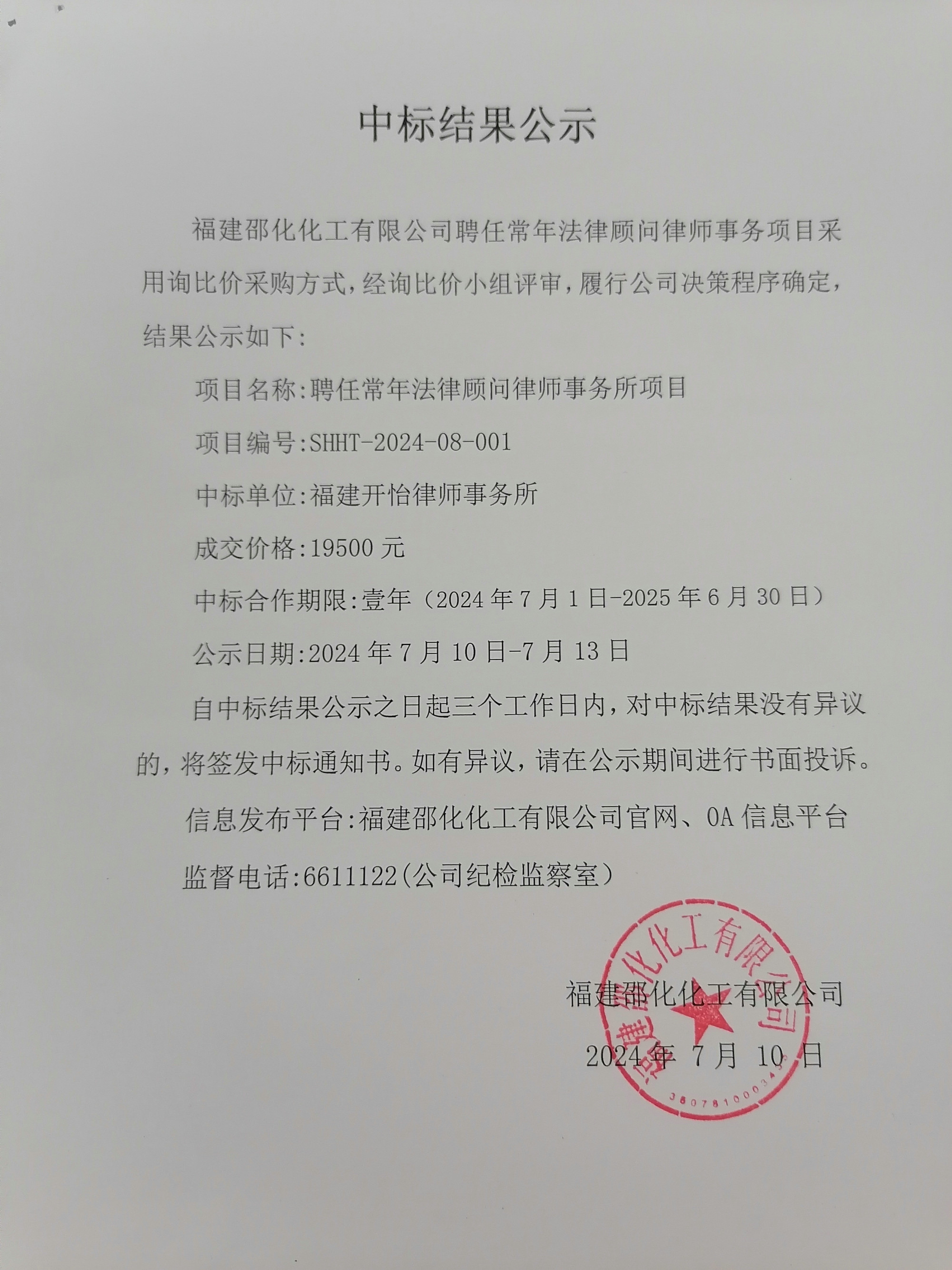 福建邵化化工有限公司聘任常年法律顧問律師